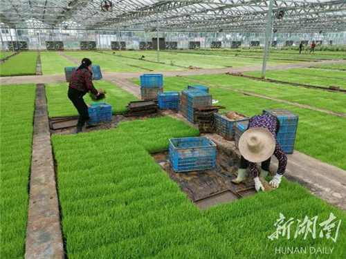 2019年仲夏,安仁縣鑫亮糧油發展有限公司智能育秧大棚內一片繁忙的景象。工人們忙于印刷播種和中稻浸種工作,浸種池內的谷種在水中萌動,育秧暗室里蒸汽彌漫,一疊疊秧盤里綻放出白玉般幼芽,大棚內一片翠綠、春意盎然..